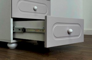 Корпус выполнен из ЛДСП толщиной 16 мм, фасад изготовлен из МДФ в плёнке ПВХ и декорирован фрезеровкой, характерной для серии Милана. Оригинальные круглые ручки и опоры завершают образ, подчёркивая аккуратный и современный дизайн мебели.